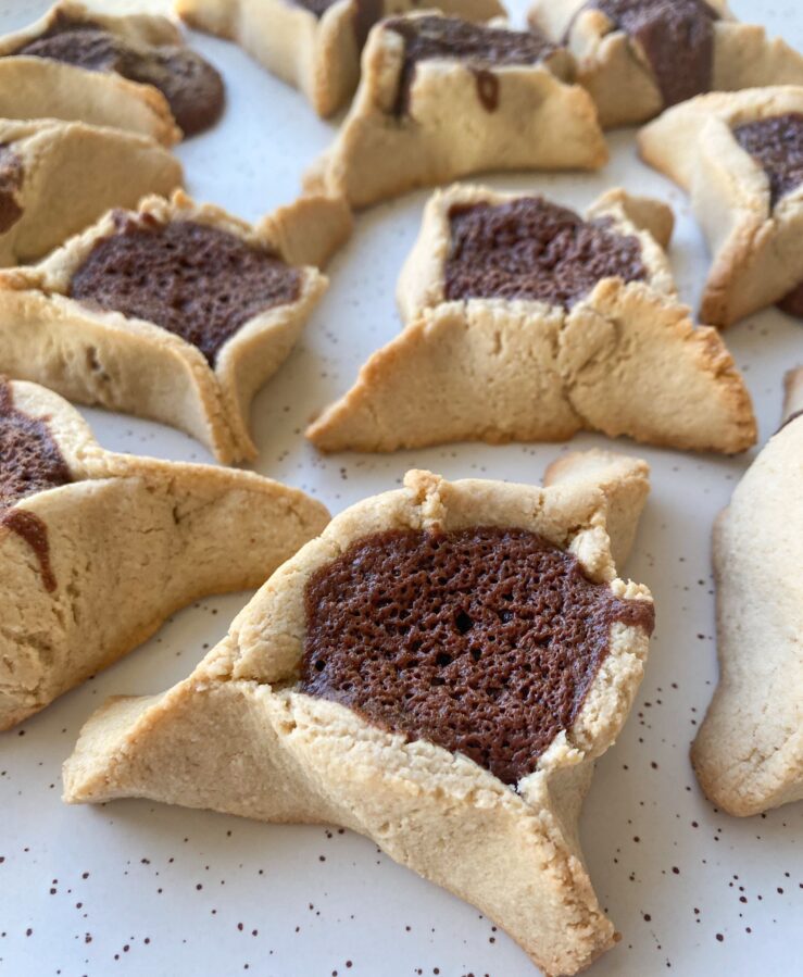- ליצירת אוזן ההמן- מהדקים כל עיגול בצק ב-3 פינות כדי לייצר צורה של אוזן המן. ממש ממש חשוב להדק היטב את הפינות (אחרת זה נפתח באפיה). את החור שנוצר במרכז ממלאים עד 3/4 גובה עם מילוי השוקולד ואופים 10-12 דקות עד שהמילוי יציב והעוגיות מעט זהובות