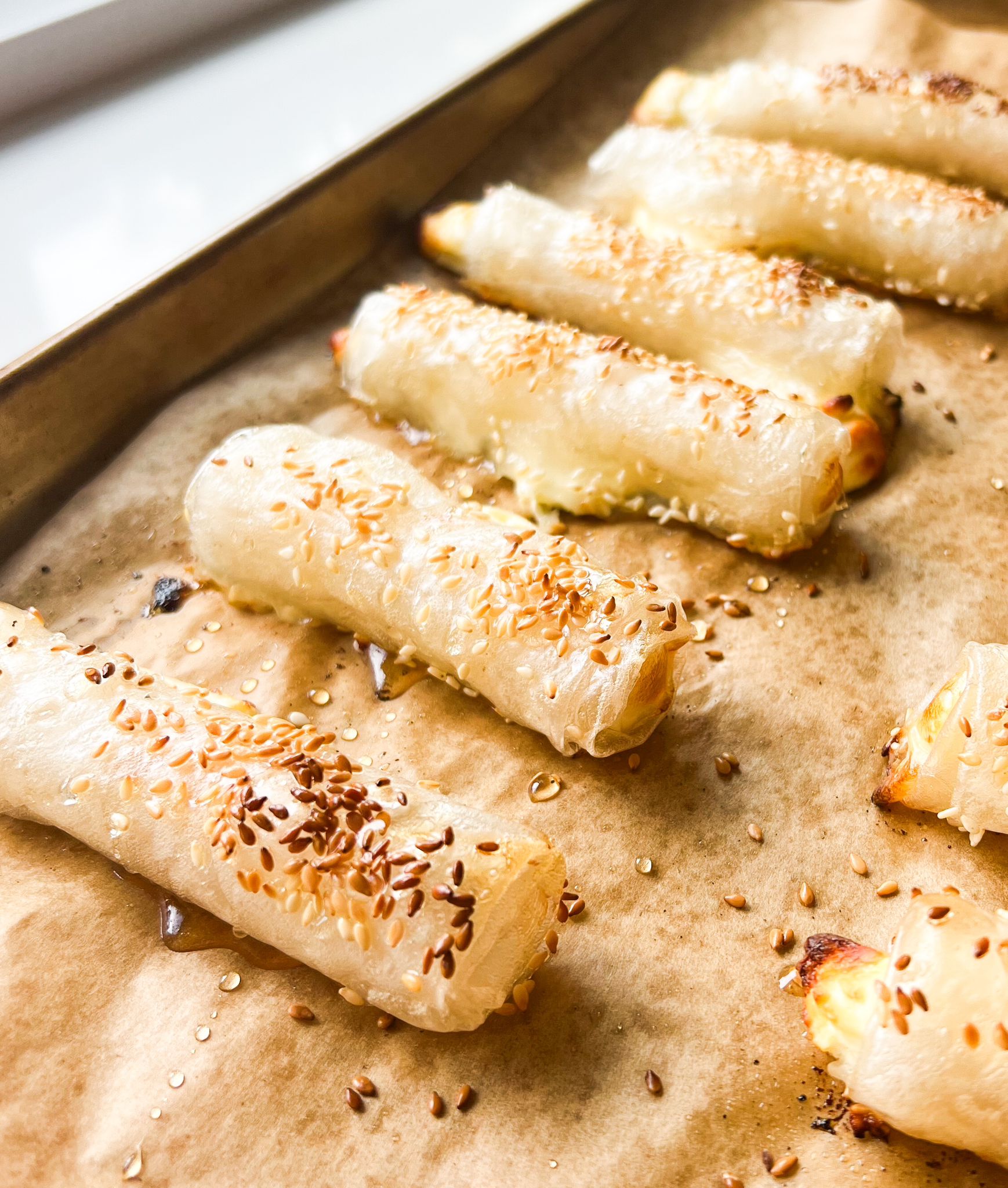 - מורחים את הסיגרים בשמן זית, מפזרים קצת שומשום ואופים 20-25 דק׳ עד שהסיגרים ממש קריספים וזהובים
